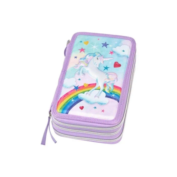 Odkryj trzykomorowy piórnik Jednorożec, który jest doskonałym wyborem dla każdego ucznia. Dzięki trzem oddzielnym przegródkom zyskasz prosty sposób na zorganizowanie i szybki dostęp do przyborów szkolnych.