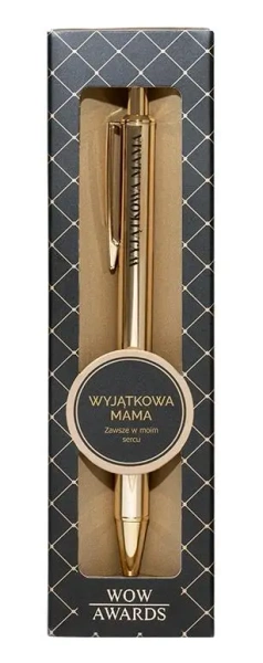 Stylowy złoty długopis zachwyca elegancką kolorystyką oraz nowoczesnym wyglądem. Jego złoty odcień połączony z czarnym napisem dodaje całości wyrafinowanego charakteru. Grawerunek "Wyjątkowa Mama" stanowi dodatkowy, osobisty akcent.