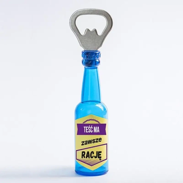 Oryginalny otwieracz w kształcie butelki z zabawnym napisem "Teść ma zawsze rację" to doskonały pomysł na praktyczny i humorystyczny prezent! Idealny na imprezy, grille czy rodzinne spotkania, a dodatkowo wyposażony w magnes z tyłu, dzięki któremu można go wygodnie przyczepić do lodówki. Cechy produktu: Materiał: trwały metal (otwieracz) i tworzywo sztuczne (rączka w kształcie butelki). Design: imitacja niebieskiej butelki z nadrukiem o humorystycznym przesłaniu. Magnes: praktyczny magnes na tylnej stronie, umożliwiający przyczepienie otwieracza do metalowych powierzchni. Praktyczność: wygodny uchwyt i solidne wykonanie, które ułatwiają otwieranie butelek. Wymiary: kompaktowy rozmiar, idealny do kieszeni lub na lodówkę. Podaruj go swojemu szwagrowi lub innemu miłośnikowi humorystycznych gadżetów - funkcjonalny, zabawny i zawsze pod ręką!