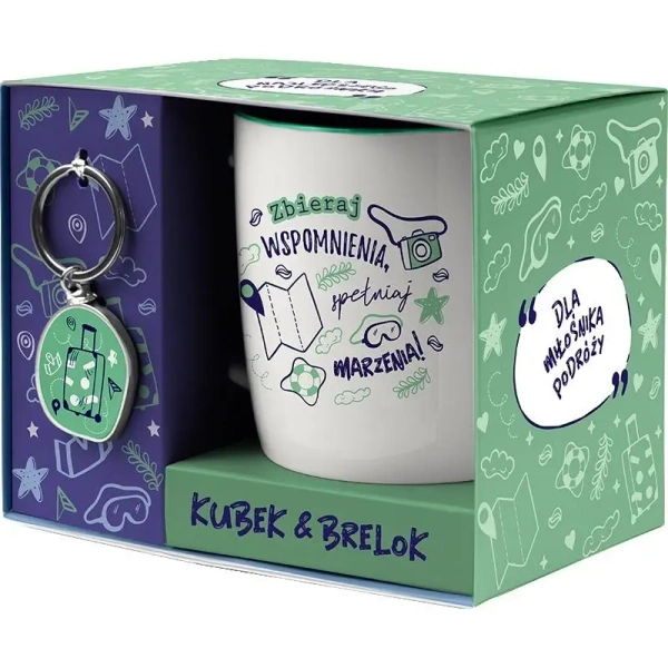 Szukasz idealnego prezentu dla osoby, która uwielbia odkrywać świat? Nasz gotowy zestaw prezentowy to doskonały wybór! Stworzony z myślą o pasjonatach podróży, łączy w sobie praktyczność i wyjątkowy design. W zestawie znajdziesz: Kubek ceramiczny o pojemności 330 ml, ozdobiony dedykowanym napisem nawiązującym do podróżniczej pasji. Wykonany z wysokiej jakości materiałów, jest nie tylko estetyczny, ale także funkcjonalny - można go myć w zmywarce. Stylowy brelok o średnicy 45 mm, idealny jako ozdoba do kluczy, plecaka czy torby. Jego personalizowany design sprawia, że świetnie pasuje do tematyki zestawu. Pudełko prezentowe, które nadaje całości elegancji i sprawia, że podarunek jest gotowy do wręczenia. Ten zestaw to nie tylko prezent, ale także sposób na wyrażenie troski i zrozumienia dla hobby bliskiej osoby. Praktyczny, estetyczny i spersonalizowany - sprawdzi się zarówno na urodziny, święta, jak i inne okazje. Specyfikacja: Kubek: Materiał: ceramika Pojemność: 330 ml Wysokość: 8,5 cm Średnica: 8,5 cm Można myć w zmywarce Brelok: Materiał: metal Średnica: 45 mm Kolor: srebrny z zielonym akcentem Spraw, aby pasja podróżowania stała się jeszcze bardziej wyjątkowa dzięki zestawowi od Be Happy Gifts!