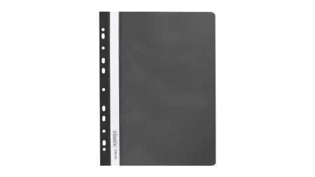 Skoroszyt posiada wymienny, papierowy pasek na bocznej krawędzi, pozwalający na łatwe oznaczenie zawartości dzięki umieszczonemu na nim kodowi kreskowemu na każdej sztuce. Dwa praktyczne wycięcia ułatwiają wysuwanie paska, co przyspiesza organizację i personalizację wnętrza skoroszytu. Zaokrąglone rogi obu okładek dodają całości estetycznego wyglądu, zapewniając jednocześnie dodatkowy komfort użytkowania.