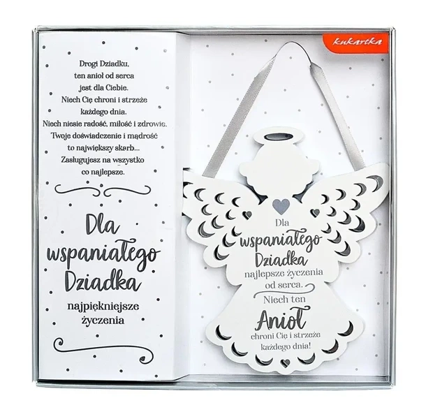 Zawieszka premium w formie Aniołka ZOP-016 to niezapomniany pomysł na prezent. Wykonana z solidnej płyty MDF z wyżłobionymi lustrzanymi zdobieniami oraz napisem w formie krótkiej sentencji. Na tylnej ściance aniołka jest tasiemka do zawieszenia na ścianie. Zawieszka zapakowana jest eleganckie i trwałe pudełeczko z życzeniami w środku, dodatkowo zabezpieczone folią pcv. Cechy szczególne: typ: zawieszka do powieszenia wielkość orientacyjna: wysokość: 14 cm, szerokość: 12,5cm (skrzydła), grubość: 7mm zdobienie: wzory wyżłobione w drewnie z lustrzaną folią, kolorowy napis okazja: Dzień Dziadka