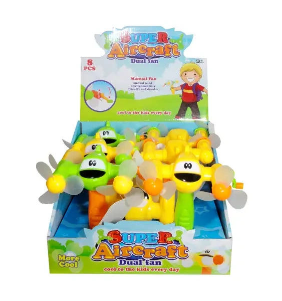 Zabawny plastikowy podwójny wiatraczek kształtem przypominający samolot do ochłody w cieplejsze dni. Wiatraczek na korbkę.