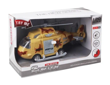 Plastikowy helikopter wojskowy dla dzieci. Zabawka świeci kolorowym światełkiem i wydaje dźwięki wzoszenia się samolotu w powietrze oraz strzelania.