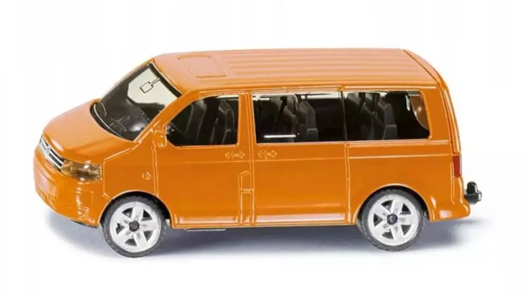 Pomarańczowa furgonetka Volkswagen T5 Multivan to wieloosobowe auto rodzinne. Samochodzik jest klasycznego, prostokątnego kształtu. Posiada pakowny bagażnik i szeroką przednią szybę. Wewnątrz autka dostrzec można szczegó