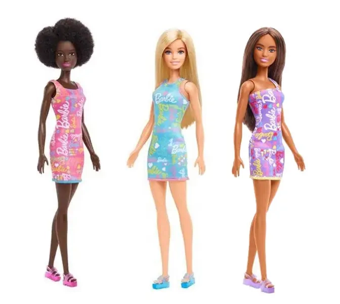 Lalka Barbie z długimi włosami w letniej kreacji- sukienkę ozdabiają gwiazdki, serduszka i napisy Barbie, a różowe sandałki uzupełniają cały strój, tworząc elegancki styl. Barbie posiada ślicznie pomalowane, różowe usta oraz długie rozpuszczone włosy, które dziewczynki mogą czesać. Zabawa Barbie zachęci dziewczynki do opowiadania historyjek .Dzieci pokochają zabawę inspirowaną światem Barbie. Lalka nie stoi samodzielnie. Lalki Barbie słyną z wysokiej jakości wykonania. Od pokoleń małe dziewc