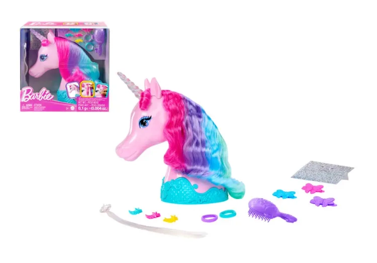 Przygotuj się na magiczną zabawę w wymyślanie fryzur z głową do stylizacji Barbie® Jednorożec. Dzięki 10 uroczym akcesoriom i błyszczącym naklejkom czeka Cię wspaniała za