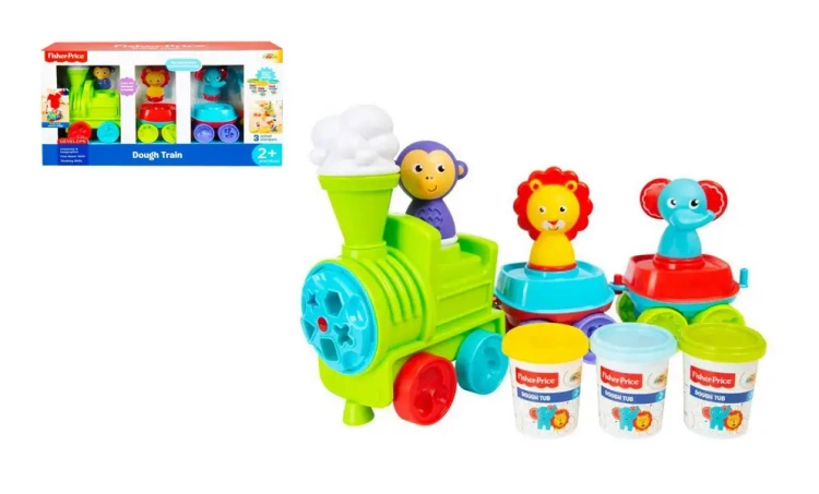 Kolorowy pociąg z figurkami zwierzątek i ciastoliną cieszy i uczy ! Zestaw składa się z pociągu oraz dwóch wagoników z małpką, słonikiem i lwem.