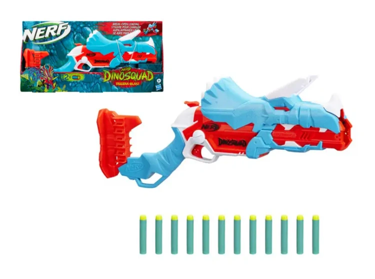 Bądź gotowy na akcję z blasterem Nerf DinoSquad Tricera, który wystrzeliwuje trzy strzałki! Ten blaster posiada unikalny dinozaurowy wzór naśladujący Triceratopsa. Ładowanie blastera jest otwierane - wystarczy nacisnąć przedni klakson na głowie dinozaura, aby otworzyć lufę i odkryć komorę z miejsce na strzałki. Wystarczy załadować 3 rzutki, zamknąć lufę, pociągnąć w dół młotek i nacisnąć spust, aby strzelać jednym pociskiem w kierunku celu.