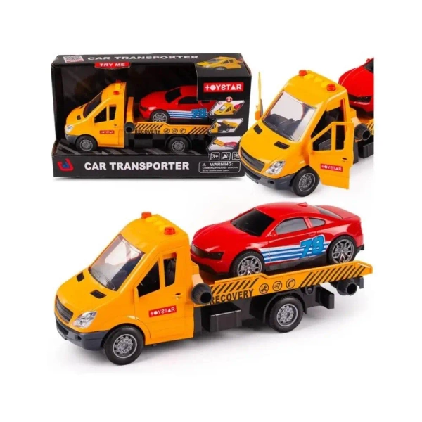 Zestaw pojazdów, który składa się z samochodu ciężarowego lawety na której znajduje się samochodzik sportowy. Zestaw idealny dla każdego chłopca trzylatka. Zabawkowy bus laweta pomoc drogowa posiada wiele ruchomych elementów a także efekty świetlne i dźwiękowe. Pojazd wykonany został z dbałością o szczegóły i detale, dzięki czemu bardzo dobrze odzwierciedla prawdziwy pojazd pomocy drogowej. Jeżeli Twoje dziecko uwielbia samochody, ciężarówki i pojazdy to ta zabawka jest właśnie dla niego. Świetnie uzupełni tradycyjne autka czy pojazdy budowlane. Ten pojazd dla dzieci zajmie Twojego urwisa na długie godziny zabawy!