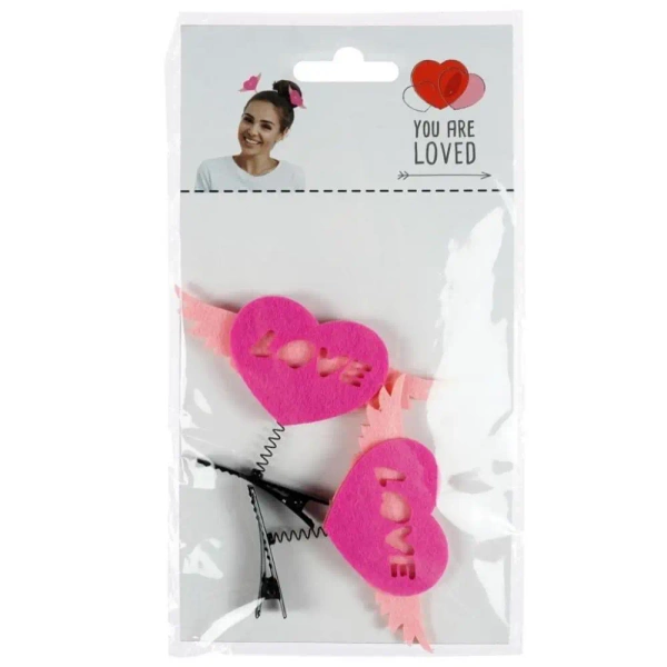 Klipsy/spinki do włosów z różowym/filcowym serduszkiem z napisem LOVE na sprężynce. 2 szt. w opakowaniu.