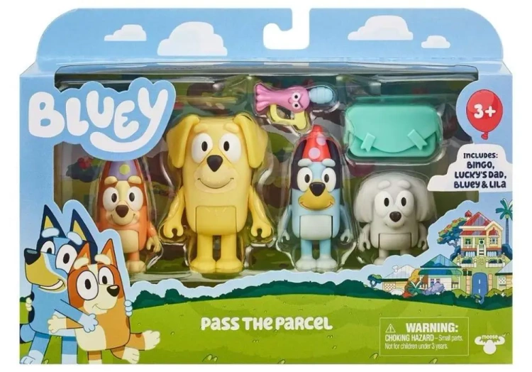 Zestaw 4 figurek Bluey "Pass The Parcel"! Kto będzie tym szczęśliwcem, który otworzy paczkę i zdobędzie nagrodę Water Squirter, gdy ucichnie muzyka? W tym zabawnym pakiecie Bluey i Bingo mają na sobie czapki imprezowe. Dodatkowo znajdują się w nim 2 fajne akcesoria do zabawy paczka, którą można rozpakować i tryskacz wody! Bluey, Bingo, tata Luckyego i Lila mają ruchome ręce i ciała