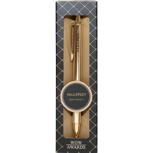 Stylowy złoty długopis wyróżnia się swoją wysmakowaną kolorystyką i nowoczesnym wyglądem. Połączenie złotego wykończenia z czarnym grawerem tworzy wyrafinowany efekt, podkreślając osobisty charakter upominku. Bez względu na to, czy jest to prezent dla przyjaciela, czy ukochanego, jego estetyka zrobi wrażenie.