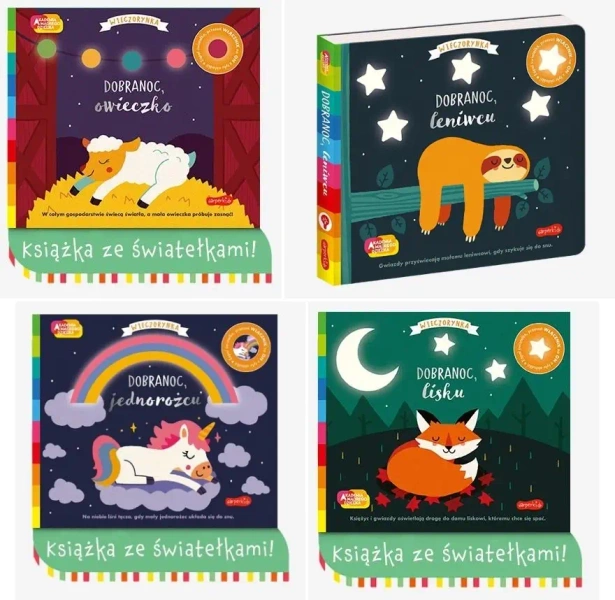 Książeczka ze światełkami Dobranoc jednorożcu z serii Wieczorynka, opowiada o małym jednorożcu, który nie może zasnąć, ponieważ zgubił swoją ulubioną przytulankę. Odwiedza po kolei swoich przyjaciół by sprawdzić czy któryś z nich nie ma przypadkiem pluszaka. Kolorowa tęcza oświetla mu drogę do innych zwierzątek: narwala, lamy, flaminga, dinozaura i sówek. W końcu znajduje swojego misia i zasypia wtulony w mamusię.
