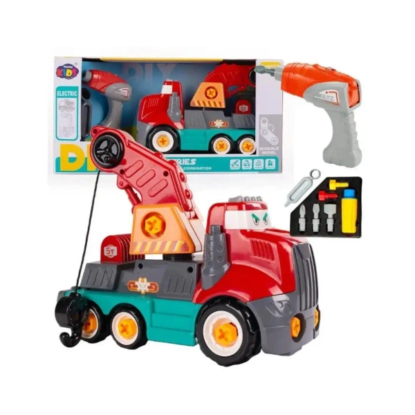 Kolorowy dźwig z ruchomym ramieniem to świetna zabawka dla dziecka, które uwielbia majsterkować - zabawka zajmie Twoją pociechę na wiele godzin. Do zabawki dołączono zestaw narzędzi - wkrętarkę, śrubokręt oraz wymienne końcówki stanowiące nieodłączny element tej zabawki, pozwalając dzieciom na samodzielne rozkręcanie i skręcanie pojazdu. Zabawka rozwijająca koordynację ruchową i wzrokową dziecka jest świetną formą spędzania czasu dla dziecka. Dźwig do samodzielnego skręcania to zabawka, która doskonale pobudzi kreatywność u dzieci. Model pojazdu wzorowany na prawdziwym dźwigu z mnóstwem elementów do samodzielnego skręcania i rozkręcania zachwyci każdego malucha! Ciekawe wykonanie, uśmiechnięta buźka - na pewno zadowolą każde dziecko.
