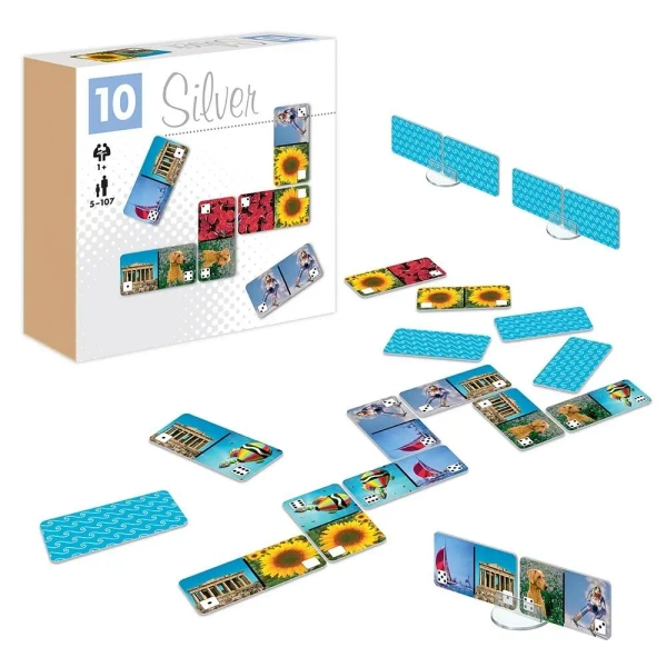Domino Silver to seria klasycznych gier składających się z prostokątnych tabliczek, przedzielonych na pół za pomocą różnej grafiki. Zabawa polega na właściwym dopasowaniu elementów prezentujących ten sam obrazek. Wygrywa w niej ten, kto pierwszy pozbędzie się swoich tabliczek, przez dokładanie ich do odpowiedników leżących na stole. Większy niż standardowo rozmiar tabliczek ułatwia chwytanie.