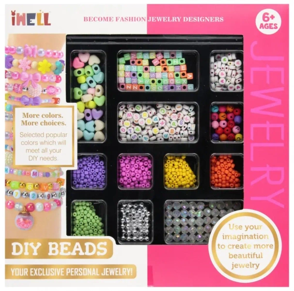 W zestawie znajdują się różnego rodzaju koraliki - w różnych rozmiarach, kolorach , kształtach i fakturach, 2x żyłka do nawlekania koralików. Produkt wykonany z plastiku. Zawiera małe elementy.