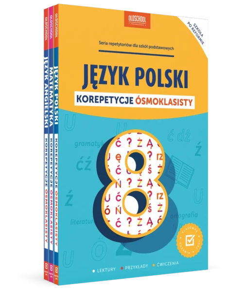 Pakiet: Korepetycje ósmoklasisty. Język polski, matematyka, angielski. z serii "OLDSCHOOL - stara dobra szkoła" przeznaczone jest dla uczniów ósmej klasy szkoły podstawowej. Korepetycje ósmoklasisty to świetna pomoc dla każdego ucznia kończącego podstawówkę, który chciałby samodzielnie powtórzyć wiadomości z języka polskiego, matematyki, angielskiego i poćwiczyć przed egzaminem.