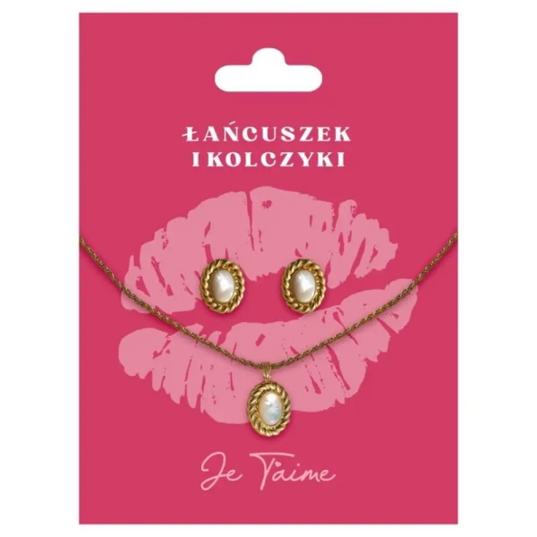 "Pozłacany zestaw biżuterii na Walentynki - łańcuszek i kolczyki Elegancki zestaw biżuterii, który zachwyci każdą kobietę. Pozłacany łańcuszek i kolczyki o delikatnym owalnym kształcie dodają blasku i subtelnie podkreślają urodę. Wykonane ze stopu cynku i metalu, pięknie lśnią w świetle, oferując ponadczasowy urok. Zestaw zapakowany na eleganckiej podkładce, gotowy do wręczenia na Walentynki. To idealny wybór dla kobiety ceniącej klasykę z romantycznym akcentem. SPECYFIKACJA: Pozłacany łańcuszek i kolczyki Romantyczna podkładka Stop cynku i metalu Kolor: złoty"