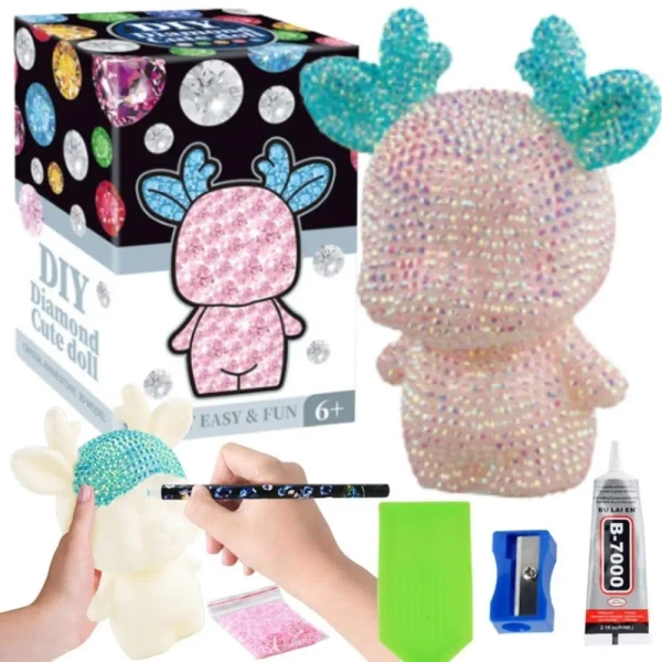 W zestawie znajduje się figurka jelonka, która stanowi bazę do wyklejania kryształkami.