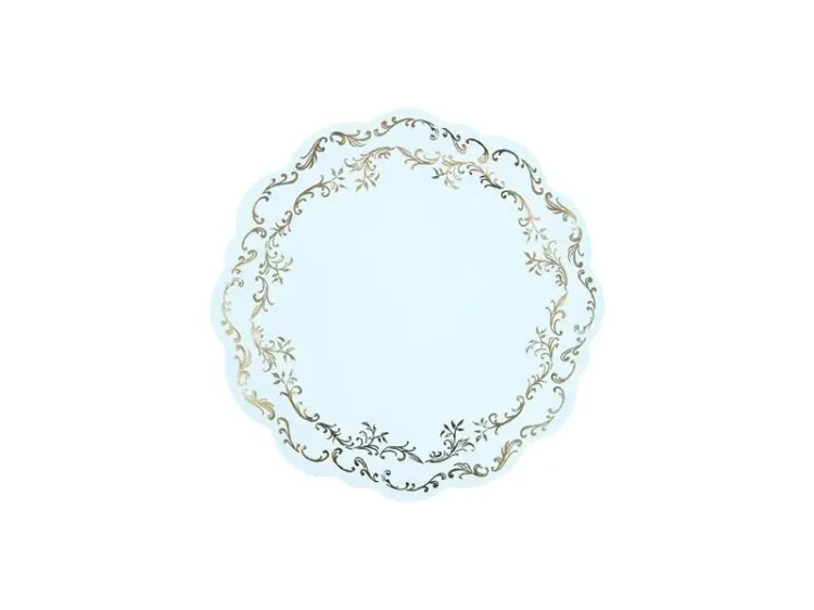 Stylowe i eleganckie podkładki pod talerze z błękitnym odcieniem, ozdobione złotym ornamentem, wprowadzą wyjątkowy klimat do każdej aranżacji stołu. Dzięki średnicy około 35,5 cm doskonale dopasowują się do różnych rozmiarów talerzy.