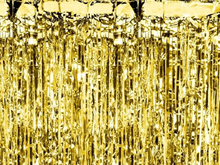 Kurtyna Party metalizowana w kolorze złotym, szerokość ok. 100 cm, wysokość ok. 200 cm. Wykonana z folii o grubości 20 um.