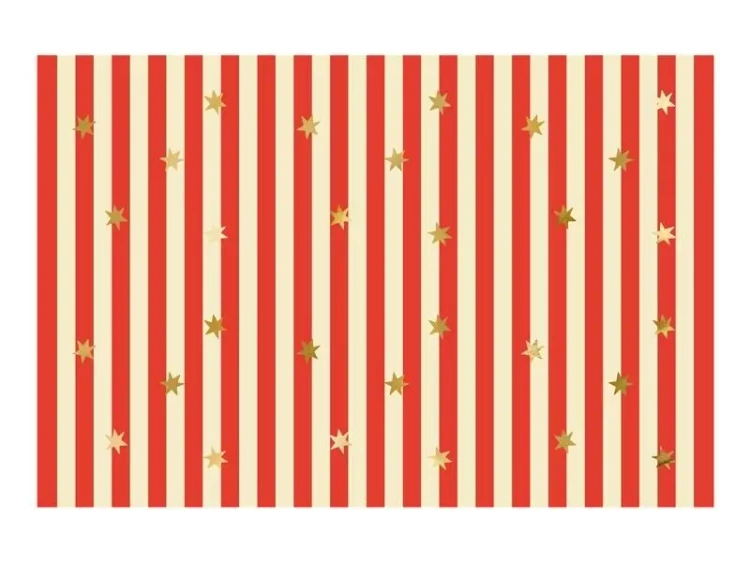 Przedstawiamy wyjątkowy obrus papierowy, ozdobiony wzorem w głębokie czerwone pasy i lśniące złote gwiazdki.