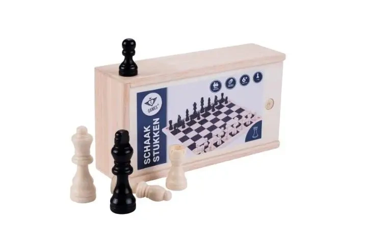 32 figury szachowe w pudełku z drewna jesionowego. Figury szachowe są czarne i mają naturalny kolor. Wysokość króla: 77 mm. Zestaw nie zawiera planszy