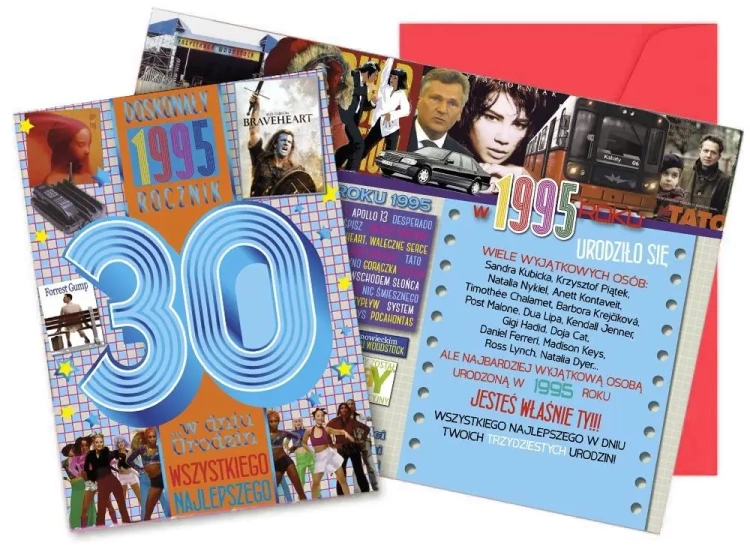 Karnet Vision "Urodziny 30" V-117 Kartka z serii To Był Rok, w której w środku i na froncie znajdują się ciekawe wydarzenia z danego roku. Wykonane z niezwykłą dbałością o szczegóły, zdobione folią holograficzną i w całości pokryte folią matową dla podkreślenia efektu prostoty i elegancji. Każdy karnet zawiera w środku starannie dobrane życzenia oraz dopasowaną kopertę. W powiększonym formacie 140x190 mm. Cechy szczegółowe: wnętrze: kolorowe, wyjątkowe życzenia w środku, w komplecie: dopasowana kolorystycznie koperta. wymiary kartki 14 x 19 cm okazja: urodziny