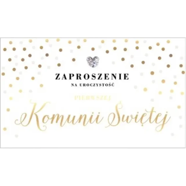 Rodzaj produktu: Zaproszenie na komunię. Zawartość opakowania: pakiet zawierający pięć zaproszeń wraz z dopasowanymi kopertami. Dodatki: każde zaproszenie posiada co najmniej dwa uszlachetnienia - złocenie, srebrzenie, perłową albo holograficzną folię oraz inne dodatki. Okazja: Pierwsza komunia święta.