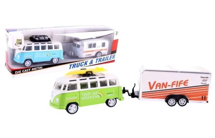 Zawartość zestawu: kamper z metalową karoserią oraz plastikowa przyczepa.