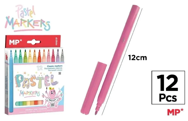 Odkryj zestaw 12 pastelowych flamastrów, które zachwycą swoją delikatnością i subtelnymi odcieniami. Każde opakowanie MP składa się z dwunastu kolorów, które doskonale sprawdzą się w różnych artystycznych projektach.