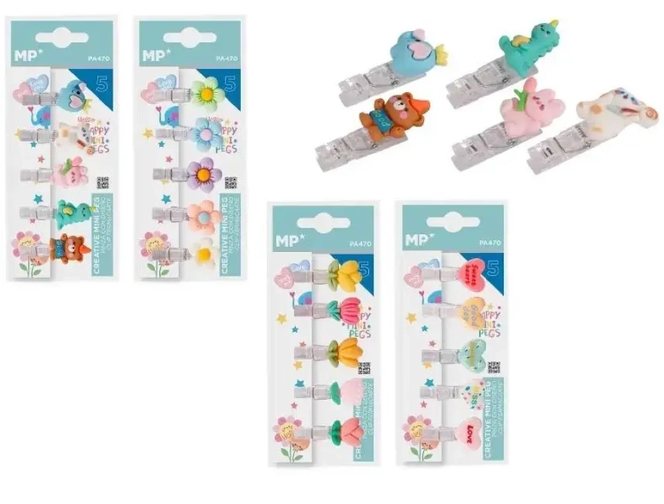 W zestawie znajduje się pięć sztuk klamerek dekoracyjnych oferowanych przez markę MP. Produkty te wyróżniają się swoim estetycznym wyglądem, co czyni je doskonałym dodatkiem do różnych projektów artystycznych czy dekoracyjnych.