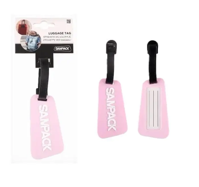 Zawieszka do walizek, plecaków lub innego bagażu z miejscem na wpisanie danych kontaktowych. Wykonana z elastycznego silikonu z tłoczeniem. Z regulowanym paskiem i przezroczystym plastikowym okienkiem z tyłu, które pozwala zobaczyć wpisane dane. Wymiary: 90 x 54 mm. Kolor różowy.