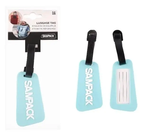 Zawieszka do walizek, plecaków lub innego bagażu z miejscem na wpisanie danych kontaktowych. Wykonana z elastycznego silikonu z tłoczeniem. Z regulowanym paskiem i przezroczystym plastikowym okienkiem z tyłu, które pozwala zobaczyć wpisane dane. Wymiary: 90 x 54 mm. Kolor błękitny.