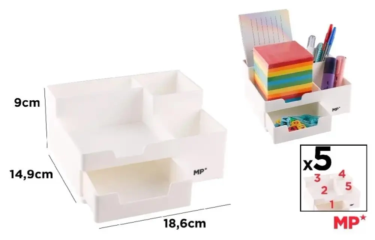 Ten sprytny organizer wyróżnia się obecnością praktycznej szufladki, która pomoże Ci przechować niezbędne akcesoria biurowe w jednym miejscu. Dzięki temu wszystkie ważne przedmioty będą zawsze pod ręką.