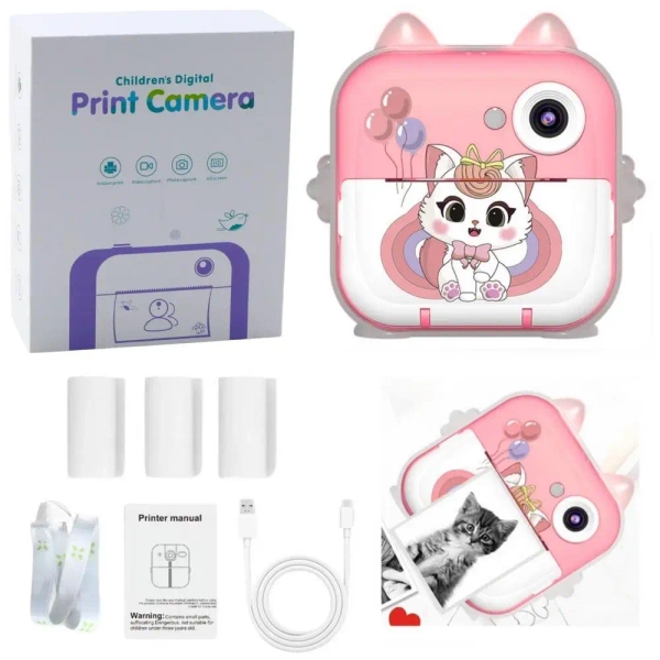 APARAT NATYCHMIASTOWY Z DRUKARKĄ TERMICZNĄ KOTEK RÓŻOWY Aparat natychmiastowy dla dzieci to przełomowe urządzenie 4w1, które łączy funkcje aparatu fotograficznego, kamery, mini drukarki termicznej oraz wbudowanych gier. Dzięki nowoczesnej technologii pozwala na dokumentowanie najpiękniejszych chwil, nagrywanie filmów i natychmiastowe drukowanie zdjęć - wszystko to bez potrzeby użycia tuszu. Jest to idealne rozwiązanie dla dzieci, które uwielbiają fotografię i kreatywną zabawę, a także dla rodziców szukających praktycznego i edukacyjnego gadżetu. Dzięki drukarce termicznej aparat umożliwia błyskawiczne drukowanie zdjęć czarno-białych w dowolnym momencie. To świetny sposób na tworzenie własnych albumów, personalizowanych naklejek i rysunków. Wystarczy włożyć papier termiczny, a zdjęcia można drukować bez żadnych dodatkowych kosztów związanych z tuszem. Poręczna, lekka i kompaktowa konstrukcja sprawia, że aparat doskonale sprawdzi się zarówno w domu, jak i w podróży. Można go bez problemu zabrać na wycieczkę, imprezę, do szkoły czy na wakacje, aby w każdej chwili uchwycić ważne momenty i natychmiast cieszyć się ich fizyczną formą. Oprócz funkcji fotograficznych aparat oferuje wbudowane gry edukacyjne, które rozwijają spostrzegawczość, logiczne myślenie oraz refleks dziecka. To doskonała alternatywa dla smartfonów i tabletów, która angażuje dziecko w twórczą zabawę bez nadmiernego korzystania z ekranów dotykowych. Ten wielofunkcyjny aparat to idealny pomysł na prezent, który zapewni wiele godzin świetnej zabawy i rozwijania kreatywności. SPECYFIKACJA Kolor: Różowy Rozdzielczość zdjęć: 1080p / 720p (do wyboru) Matryca aparatu: 48 Mpx Rozmiar ekranu: 2,5" Regulacja gęstości wydruku: 1-7 Opcja samowyzwalacza: Tak Podświetlenie RGB: Tak (z możliwością wyłączenia) Pojemność baterii: 1000 mAh Ładowanie: USB-C Łączność: Bluetooth Wymiary: 11 x 11 x 4,5 cm Wymiary opakowania: 16 x 13,5 x 5,5cm Materiał obudowy: Wysokiej jakości tworzywo sztuczne ZAWARTOŚĆ ZESTAWU 1x Aparat fotograficzny natychmiastowy 3x Rolki papieru termicznego 1x Przewód ładujący USB-C 1x Smycz z zawieszką 1x Instrukcja obsługi 1x Oryginalne opakowanie