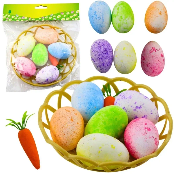 OZDOBY WIELKANOCNE W KOSZYCZKU JAJKA MARCHEWKA 7SZT Ozdoby wielkanocne w koszyczku to urocza dekoracja świąteczna, która idealnie sprawdzi się w domu, biurze czy restauracji, wprowadzając ciepłą i radosną atmosferę Wielkanocy. Zestaw składa się z sześciu kolorowych jajek ozdobionych subtelnymi plamkami oraz styropianowej marchewki, umieszczonych w plastikowym koszyczku o ażurowym wzorze. Dzięki różnorodności kolorów i starannemu wykonaniu, dekoracja pięknie komponuje się w świątecznych aranżacjach, nadając wnętrzu wyjątkowy, wiosenny charakter. Koszyczek z ozdobami To także świetna propozycja na świąteczny upominek dla bliskich lub element dekoracyjny do koszyczka ze święconką. Jajka są wykonane z lekkiego, ale trwałego styropianu, a plastikowy koszyczek jest stabilny i łatwy w utrzymaniu czystości. Dzięki klasycznym wielkanocnym motywom i pastelowym barwom, zestaw doskonale pasuje do każdej świątecznej aranżacji, zarówno tradycyjnej, jak i nowoczesnej. Może być wykorzystany samodzielnie lub jako część większej dekoracji, np. w połączeniu z kwiatami, gałązkami czy innymi ozdobami wielkanocnymi. SPECYFIKACJA: Materiał ozdób: Styropian - lekki, trwały i odporny na uszkodzenia Materiał koszyczka: Plastik - stabilny, łatwy do czyszczenia Kolory jajek: Niebieski, zielony, pomarańczowy, fioletowy, różowy, żółty - pastelowe odcienie z delikatnym efektem plamek Motywy: Jajka, marchewka - klasyczne wielkanocne symbole Średnica koszyczka: 15 cm Zastosowanie: Dekoracja stołu, stroików, aranżacji świątecznych, ozdoba na półkę, element święconki, prezent ZAWARTOŚĆ ZESTAWU: 6 styropianowych jajek w pastelowych kolorach z efektem plamek 1 styropianowa marchewka Plastikowy koszyczek jako baza dla dekoracji
