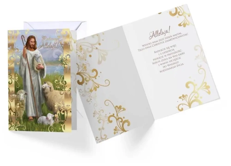 Kartka posiada tekst w środku, dołączona jest do niej koperta.
