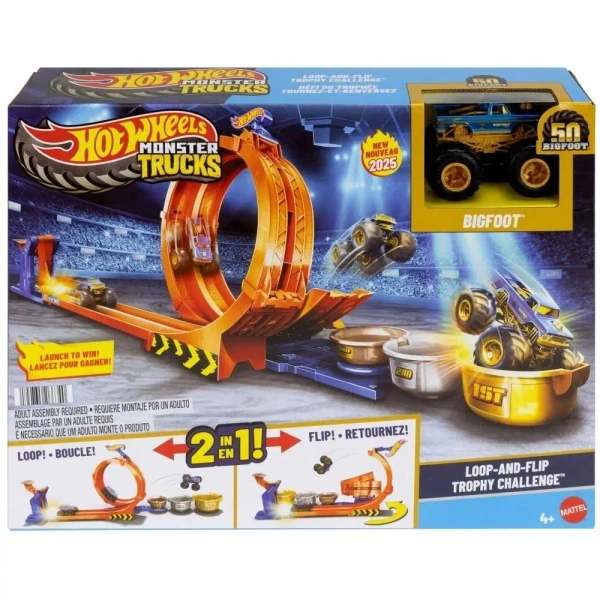 Możesz stawić czoła wyzwaniu Hot Wheels dowolnym pojazdem monster truck w skali 1:64 (sprzedawane oddzielnie). Po wyjęciu zabawek z pudełka, wystarczy złożyć tor i rozpocząć zabawę.