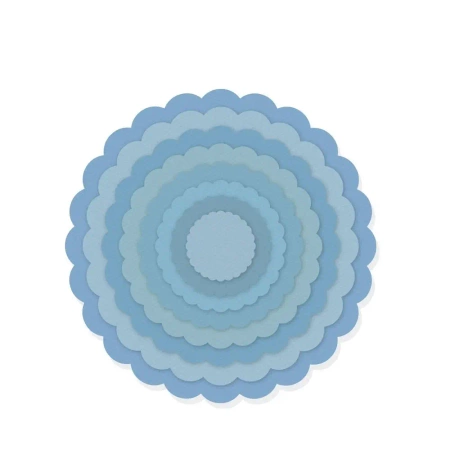 Oferujemy zestaw wykrojników z efektownym wzorem koła z falbanką, składający się z 8 różnych elementów. Każdy element ma tę samą formę, lecz różni się wielkością.