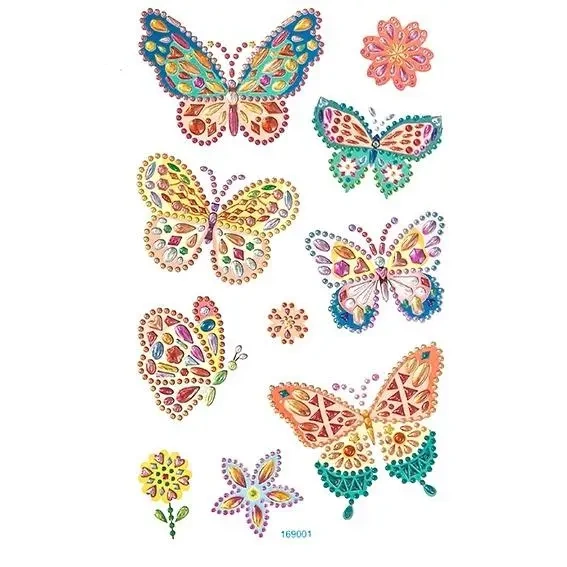 Przedstawiamy naklejki z kryształkami, które charakteryzują się wzorami pięknych, kolorowych motyli oraz delikatnych kwiatów. W zestawie znajduje się 6 motyli i 4 kwiaty, co czyni je doskonałym wyborem do personalizacji kartek okolicznościowych, albumów czy pudełek prezentowych. Naklejki te sprawdzą się również jako dekoracja na telefon czy inną gładką powierzchnię.