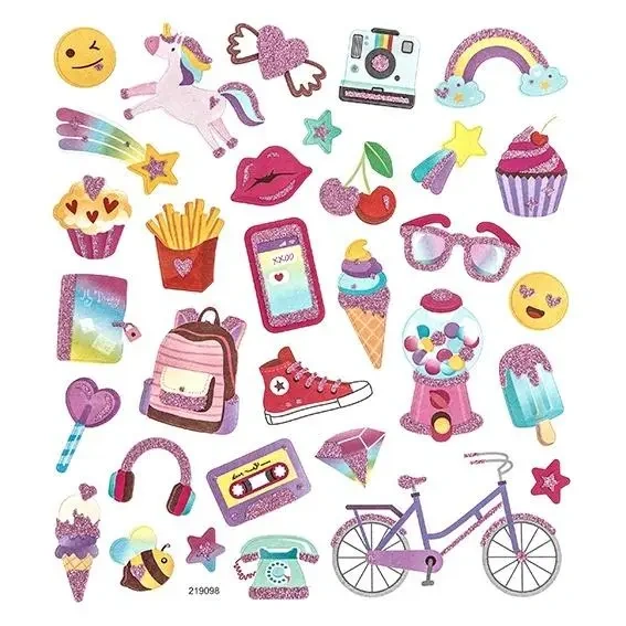 Odkryj papierowe naklejki, które zachwycają motywami pełnymi stylu. Każda z nich posiada brokatowe, różowe wykończenie, tworząc efektowną dekorację. W zestawie znajdziesz m.in. jednorożca, tęczę, okulary, czy fiołkowy rower, a także serca i muffinki.