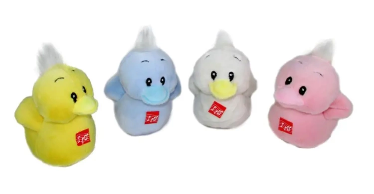 Pluszak kaczuszka. Puchata i milutka. Wielkość: 14cm. Cena za sztukę. Maskotka dźwiękowa - wydaje głos po naciśnięciu przycisku.
