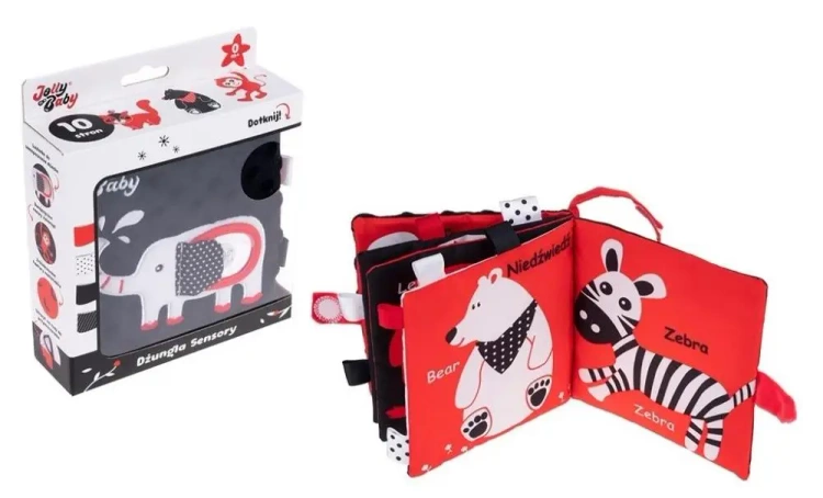 Wykonana ze zróżnicowanych materiałów książeczka uczy nazw dzikich zwierzątek, które możemy spotkać w dżungli. Na dziesięciu sensorycznych stronach znajdziemy ich podobizny oraz nazwy w języku polskim i angielskim. Całość zapinana jest na praktyczny rzep.
