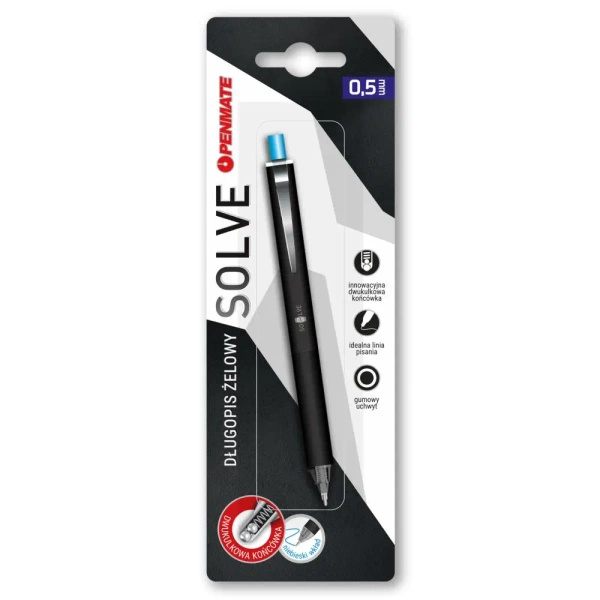Długopisy żelowe z niebieskim wkładem, posiadające innowacyjną, dwukulkową końcówkę 0,5 mm, która nadaje pisaniu niezwykłą miękkość. Tusz zasycha błyskawicznie, co jest ważne dla leworęcznych. Linia pisania wręcz idealna, bez pogrubień i innych zniekształceń.