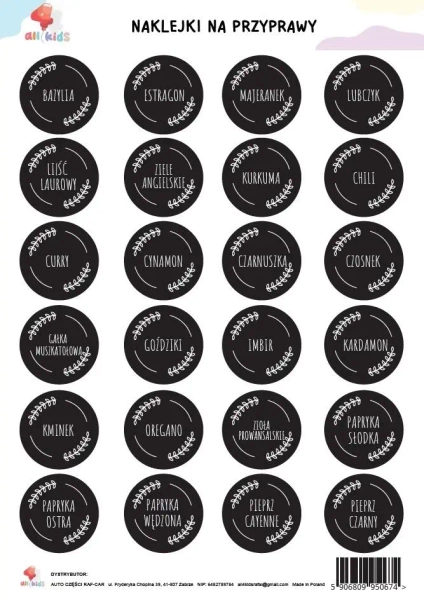 Różnorodność dostępnych nazw przypraw obejmuje zarówno najpopularniejsze, jak i te mniej spotykane. Ponadto, możesz je personalizować, tworząc własne etykiety na pustych naklejkach!