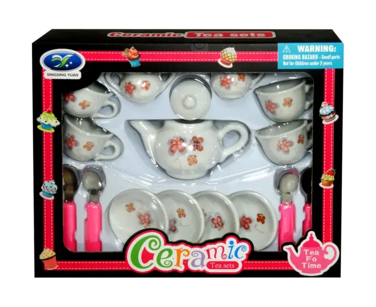 Zestaw porcelanowych naczyń do zabawy ozdobionych kolorowymi motylkami. W zestawie znajduje się czajniczek, cukierniczka, mlecznik, 4 talerzyki i 4 kubeczki.