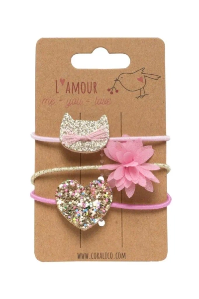 Zestaw gumek z motwem kotka, kwiatka i serduszka. Odcienie różu, bieli i złota