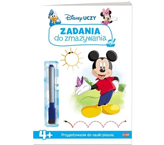 Zadania do Zmazywania to książka, która powstała w ramach programu Disney Uczy i jest dedykowana czterolatkom. Podczas doskonałej zabawy przedszkolak ma okazję zmierzyć się z różnorodnymi zadaniami edukacyjnymi, odpowiednimi dla swojego wieku. Ścieralne strony oraz dołączony do książki mazak sprawiają, że dziecko może wielokrotnie rozwiązywać ulubione zadania. Dzięki temu: udoskonala sprawność manualną i koordynację wzrokowo-ruchową, rysując szlaczki, przygotowuje się do nauki pisania, rozwija spostrzegawczość i uczy się logicznego myślenia.